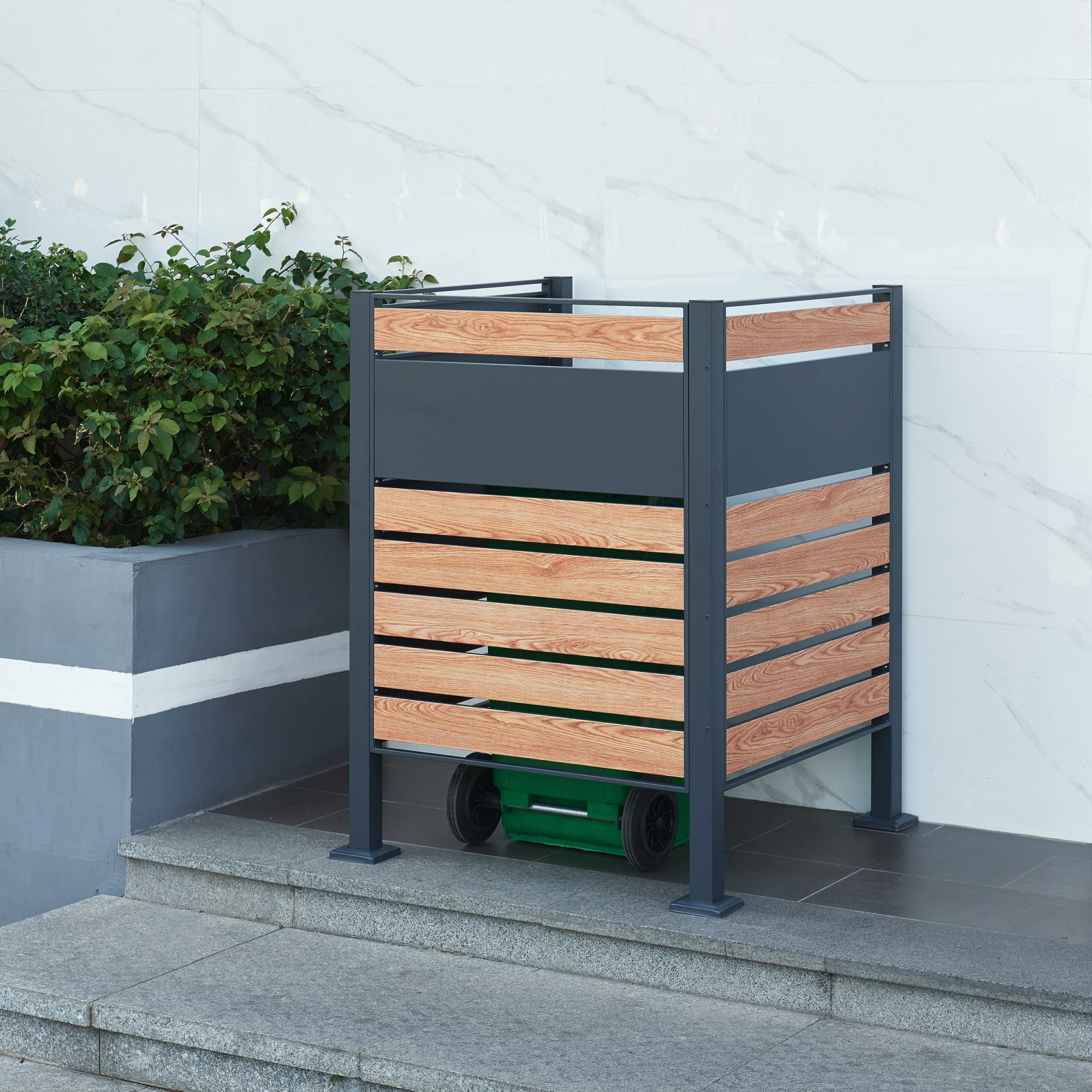 Szemetestárolónk elegáns megoldást nyújt a szemetesek elrejtésére és egyben ezzel a termékkel szebbé teheti a kültér megjelenését is, anélkül, hogy le kellene mondania annak funkcionalitásáról.